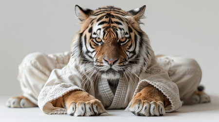 Tiger in martial arts pose wearing a gi, intense focus, white background, blending nature and discipline