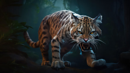 An AI generated illustration of a furious saber-toothed cat roaring and showing its sharp teeth