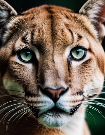 Glimpsing into the world of a puma, this close-up showcases intricate patterns in eyes and fur as it rests in its habitat. Intense gaze. Pumas are a genus of predators from cat family. Generative AI.