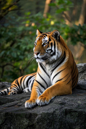 An intense eyed tiger rests gracefully in its natural habitat, surrounded by vibrant greenery, capturing the essence of wildlife.
