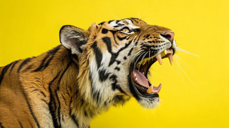 Portrait of a tiger on a yellow background. Studio shot.