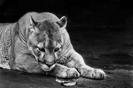 Pensive portrait, symbol of heavy thought, head down on its paws. Powerful big american wild puma cat (cougar). black and white photo.