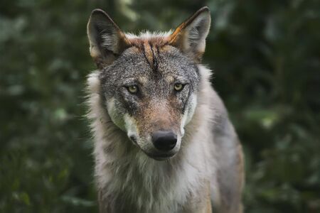 Portrait of an angry wolf in the forest at summer