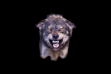 A wolf leaps forward with fierce determination, jaws wide open and fangs exposed. Its powerful muscles and sharp claws are clear, creating an intense scene in a dark background.