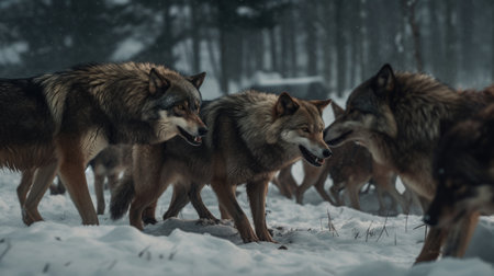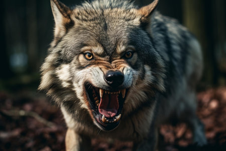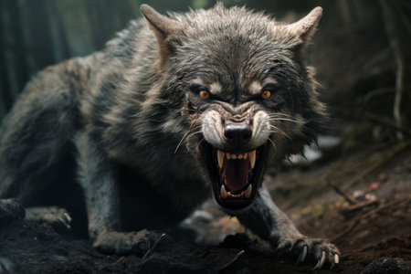 Fierce gray wolf growls menacingly in a dark, foggy woodland setting
