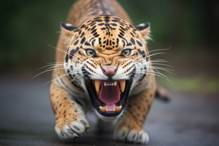 jaguar in mid-roar, showcasing teeth and power