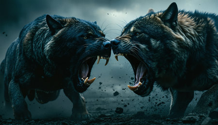 Two fierce canines face off against each other in an intense showdown, their sharp teeth bared and large jaws open wide. The air around them is filled with dust and debris, suggesting a flurry of movement or the aftermath of their clash. Both animals sport thick fur coats and have a wild, untamed look in their eyes, reflecting the ferocity of the encounter. The scene is dramatized by a dark, moody backdrop and a low-angle perspective that highlights their imposing stature. The ground under them is dark and rocky, contributing to the overall menacing atmosphere of the image. The tension between the two canines is palpable, capturing a moment of raw instinct and power.
