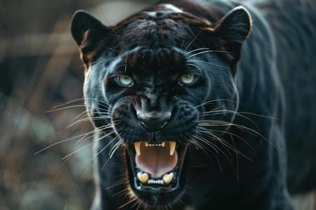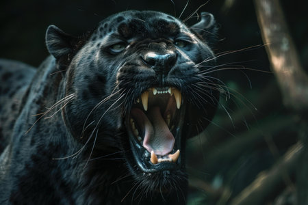Intense close-up of black panther roaring aggressively with teeth exposed, symbolizing raw nature and untamed strength.