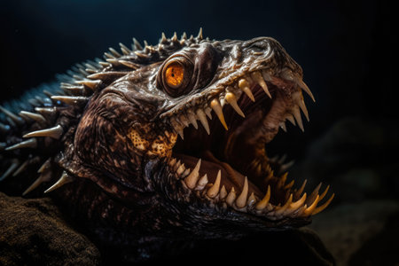 Deep-water fish at the very bottom of the ocean. A scary fish with big teeth. underwater world. Generative AI illustration
