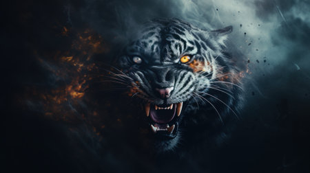 A tiger is shown in a forest, with its mouth open and teeth bared. Concept of danger and wildness, as the tiger is a powerful and fierce predator