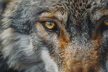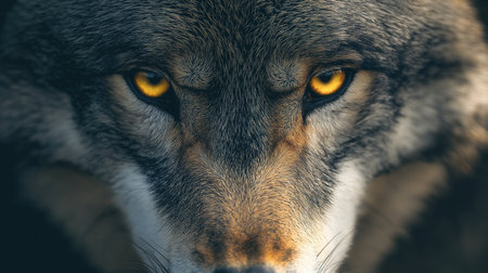 Experience the striking beauty of a wolfs gaze showcasing its intense yellow eyes and detailed fur reflecting the wild spirit and allure of this majestic creature.