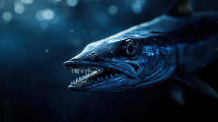 A large fish with its mouth open is swimming in the dark blue water. The fish appears to be in a state of hunger, as it is looking for food. Concept of mystery and intrigue