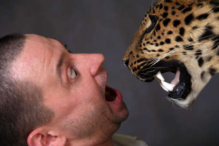 Scared the man and a muzzle of the leopard