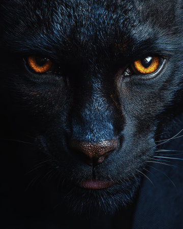 A close up of a black panther's face with yellow eyes. The image has a dark and mysterious mood, with the panther's eyes staring directly at the viewer