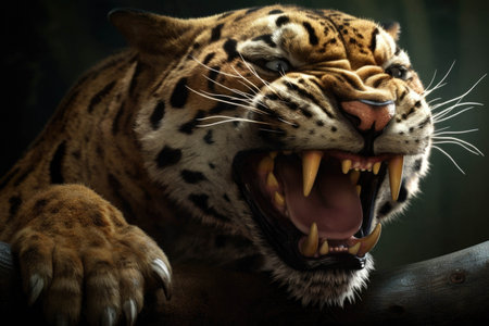 A sabertoothed tiger twitched its paw its sharp claws slicing through the air as it sized up its foe.. AI generation