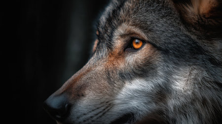This captivating close-up portrait reveals a wolf's intense eyes and intricate fur details, set against a dark background, emphasizing its wild beauty.