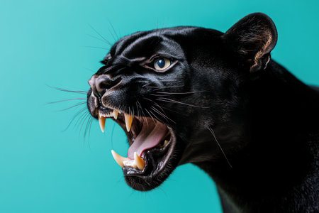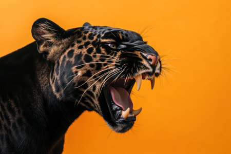 Powerful panther mid-roar with fierce expression and wide-open mouth, highlighting strength and primal instinct on a bold backdrop.