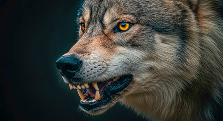 A striking close-up of a wild wolf showcasing its fierce expression and sharp teeth. This captivating image captures the essence of nature's predator in its natural habitat.
