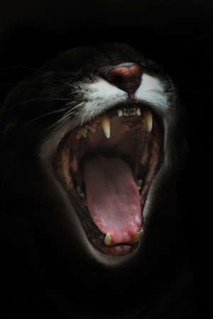 Open cat mouth, cougar mouth isolated on black background. symbol of gluttony or shout