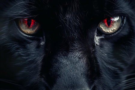 Close up of black cat's eyes with red blood spots on it