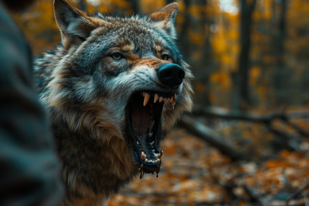 Close up of a fierce looking dog or wolf like canine yawning aggressively in an autumnal forest with trees and foliage in the background