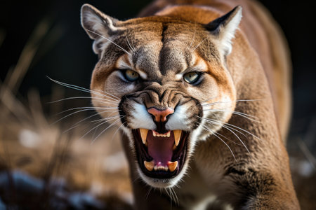Angry cougar or mountain lion hunts its prey