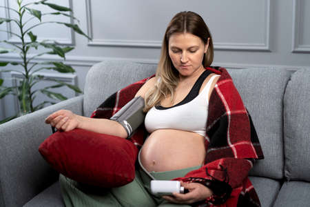 Pregnant woman measures blood pressure sitting on a gray sofa. A pregnant woman takes care of her health.
