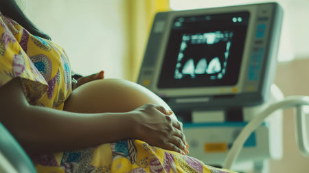 A pregnant woman sits in a clinic, gently cradling her belly while looking at an ultrasound screen. The atmosphere reflects hope and excitement for the baby's arrival