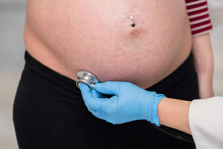 Pregnant doctor hospital. Medical clinic for pregnancy consultant. Doctor examining pregnancy woman belly holding stethoscope. Pregnancy, medicine health care concept