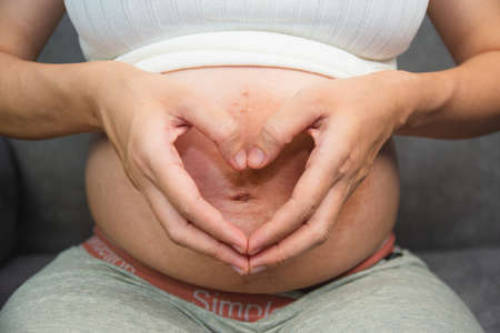 Pregnant woman shows Heart on her Big Belly. Pregnancy Concept. Pregnant Woman. Young Mother.