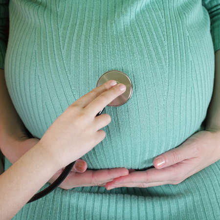 Pregnant woman listens to the baby heartbeat and movements with a stethoscope or fetoscope or Pinard Horn. Prenatal fetal health, anxiety, fear concept