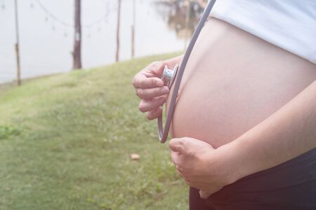 Young pregnant between 30 and 35 years old woman examines her belly with stethoscope. Closeup