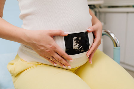 Prenatal ultrasound screening. Cropped close-up of a young pregnant woman holding a sonogram of her unborn baby inside her big belly. Happy expectant mother showing fetal ultrasound picture