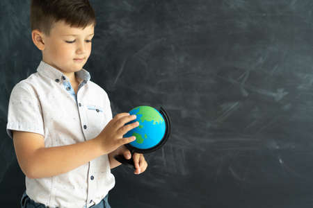 schoolboy at school with a globe in front of a chalk board. Education and study. blackboard in the background and a focused student. Back to school concept. Place for text.