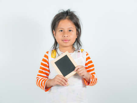 little girl holding black board on white background, asian cute girl wear pattern cloth,