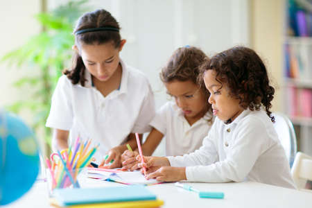Paper, kindergarten and drawing with kids in classroom for child development, artwork and color project. Friends, academy and growth with students at school for knowledge, learning and education