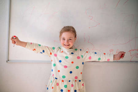 Happy little schoolgirl with down syndrome standing in front of whiteboard and looking at camera