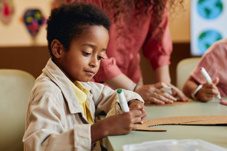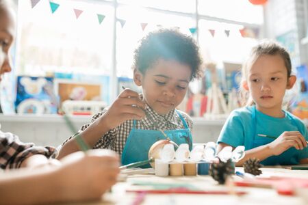 Portrait of young African American boy painting handmade dinosaur figure made of cardboard while enjoying art and craft class in school copy space