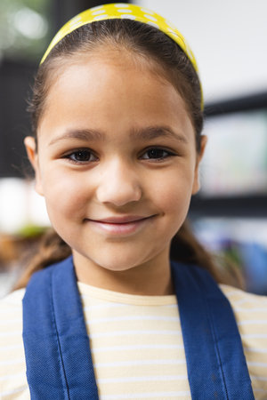 In school, in classroom, biracial young girl wearing a blue vest, smiling. She has light brown hair, dark eyes, and a yellow headband, unaltered.