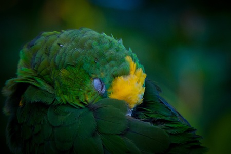 close up Australia Green rainbow wild Parrot or lorikeet, cleaning itself on a branch of tree in jungle