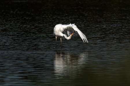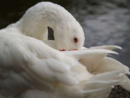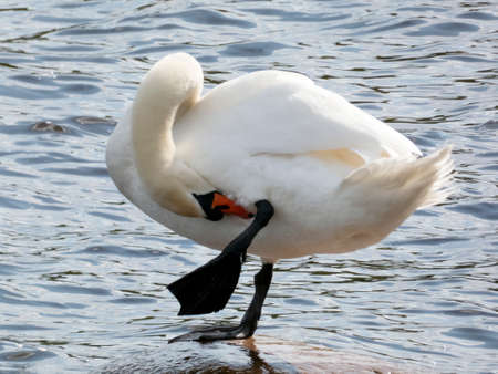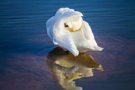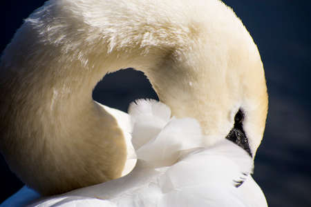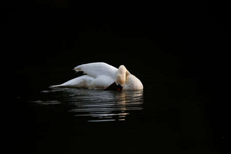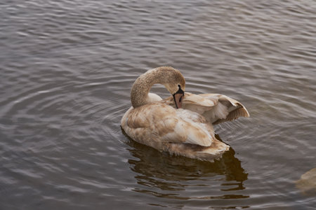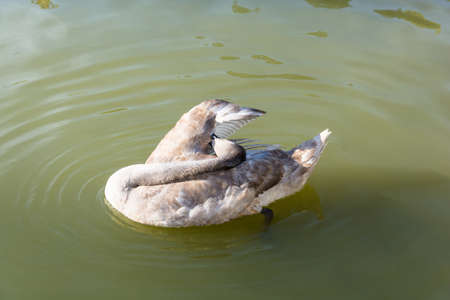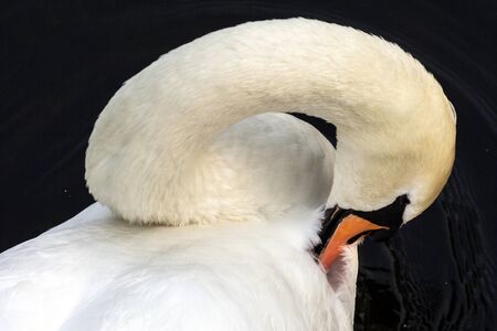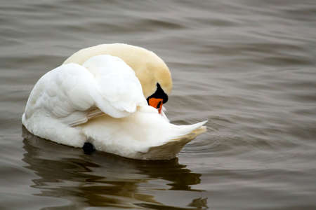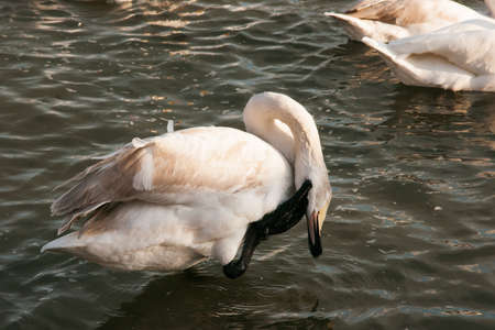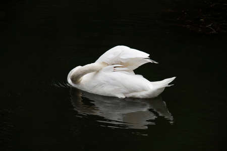 A white swan floating on the dark water and cleaning it's plumage. Birds in the city. Animal world of Russia. Swan lake in the summer.