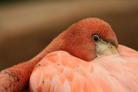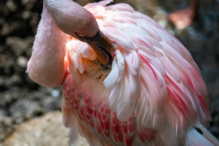 A captivating close-up portrait of a flamingo meticulously cleaning its vibrant feathers