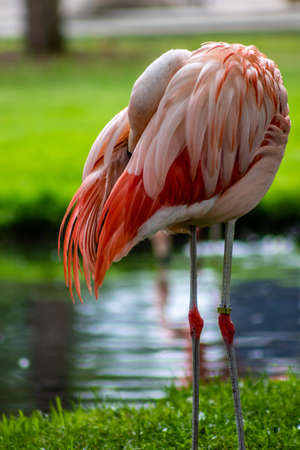American flamingo wading in a pond. Calgary Zoo, Calgary, Alberta, Canada