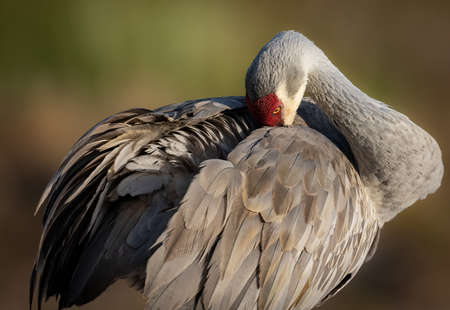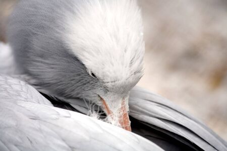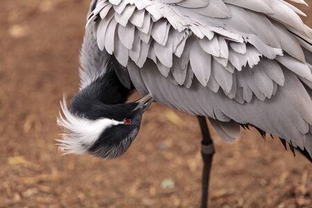 Demoiselle crane Grus virgo preens its gray and white feathers. This bird is found in Mongolia and China.