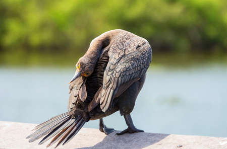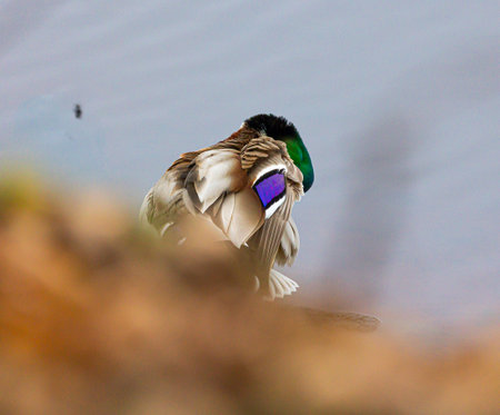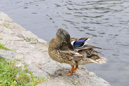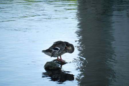 Duck sitting rock middle water cleans feathers with its beak after bathing