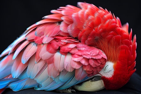 A parrot is seen peacefully resting, its brilliant red, pink, and blue feathers beautifully displayed. The texture and vivid colors of its plumage create a striking visual on a black background..