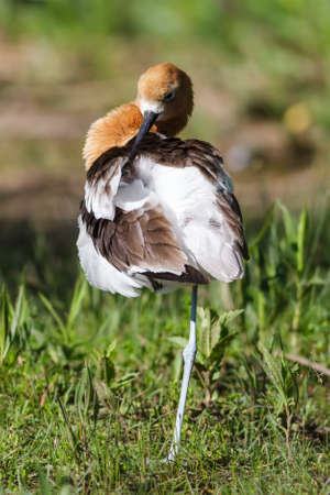 The American avocet is a large wader in the avocet and stilt family, the avocet spends much of its time foraging in shallow water or on mud flats, often sweeping its bill from side to side in water as it seeks its crustacean and insect prey