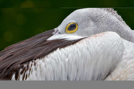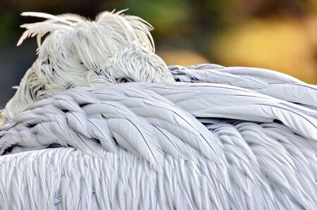 Picture of the top part of a sleeping pelican from the side with beautiful water background