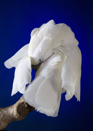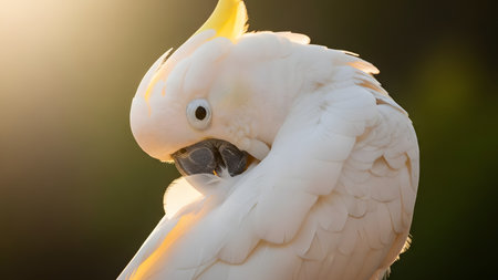 A close-up portrait of a white cockatoo preening its feathers with its beak in soft lighting. The bird's yellow crest is visible, highlighting its beauty and the detailed texture of its plumage.