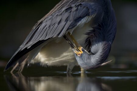 A Tricolored Heron preening its feathers while standing in shallow water in the early morning sunlight.
